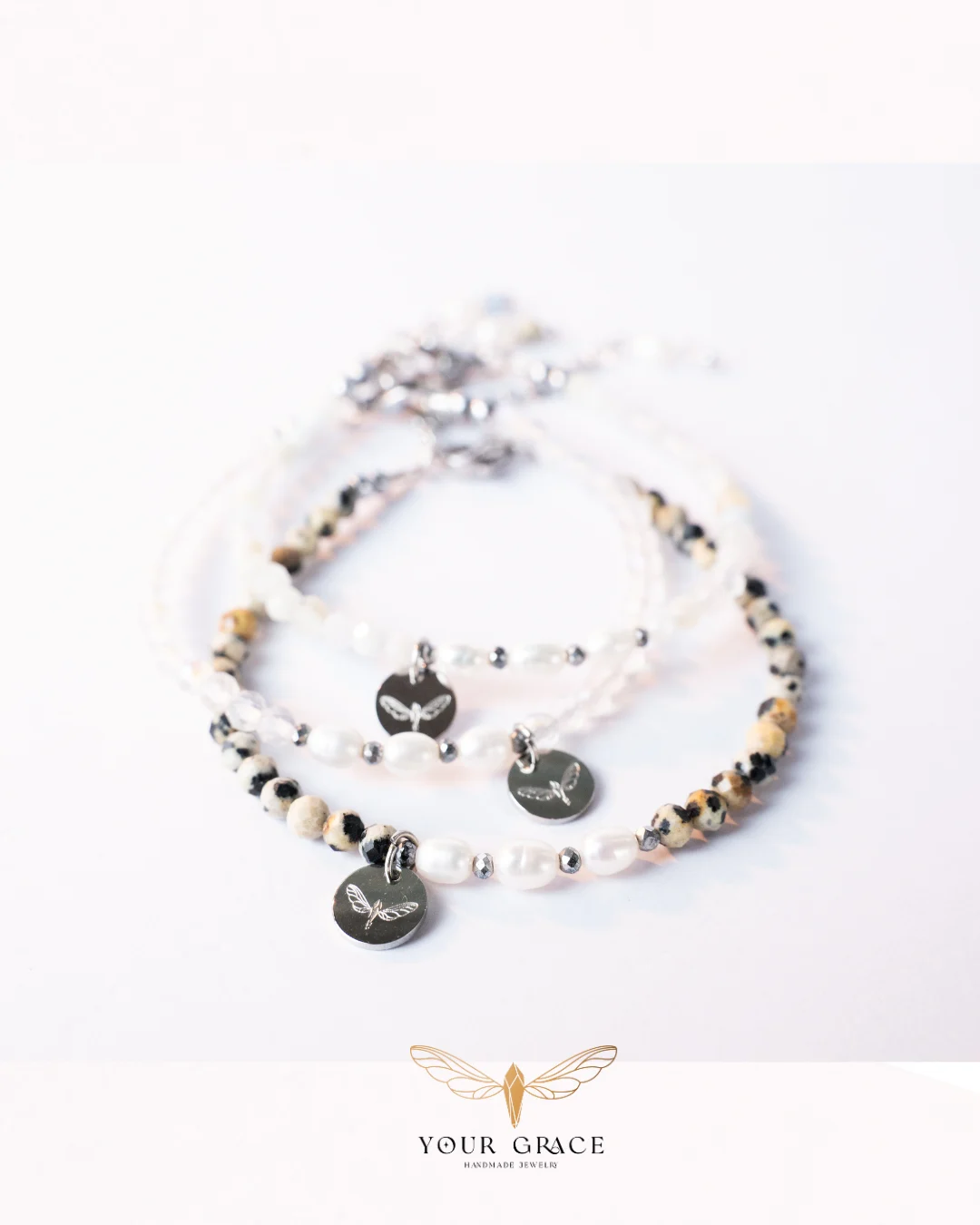 Всяка гривна е уникална, тъй като естествените камъни и перли имат различна форма и цвят.
