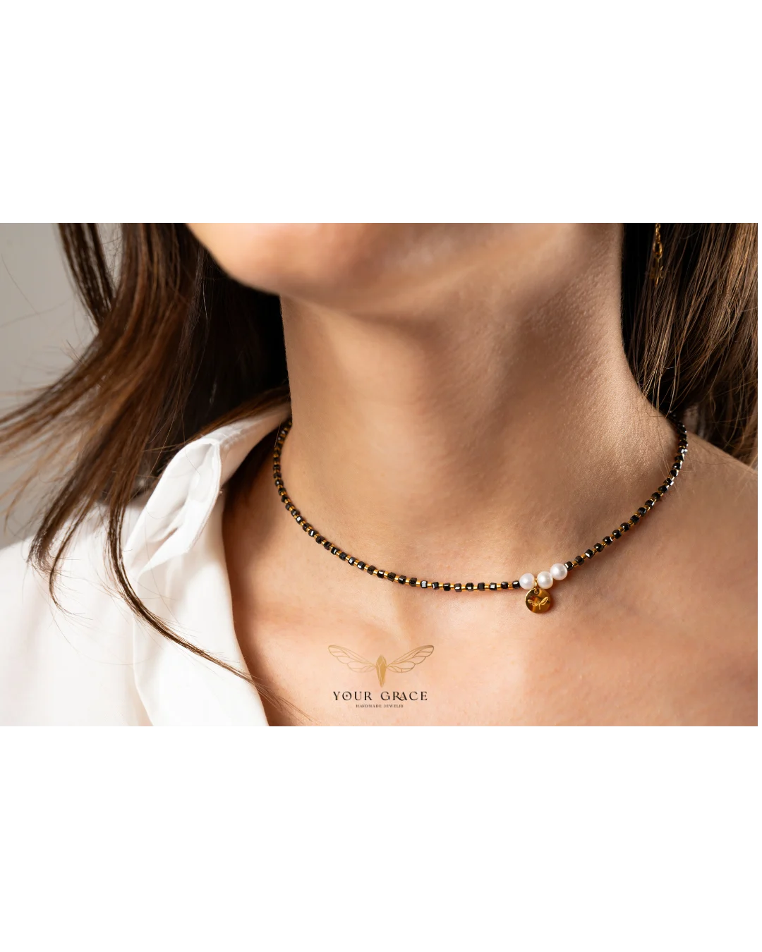 Гривна Anima е изработена от естествени камъни, сладководни перли и елементи от неръждаема стомана с PVD покритие, устойчиво на износване и мокрене.
