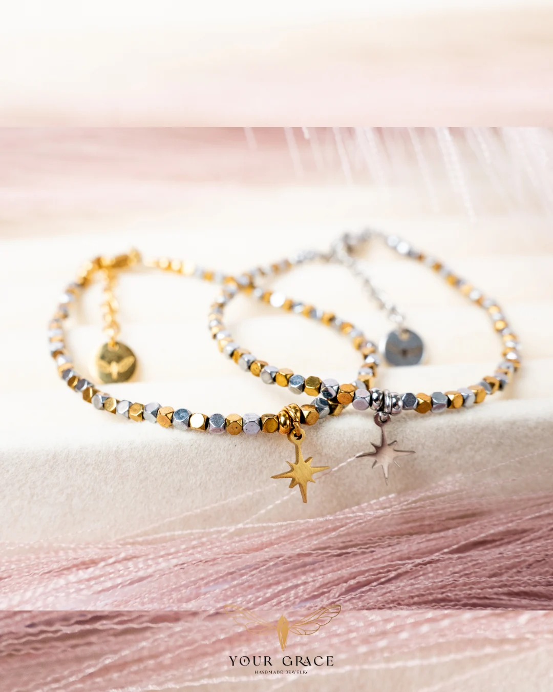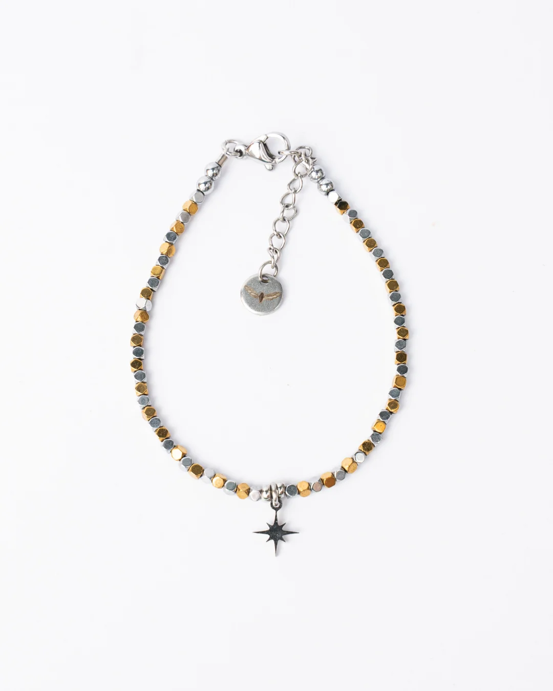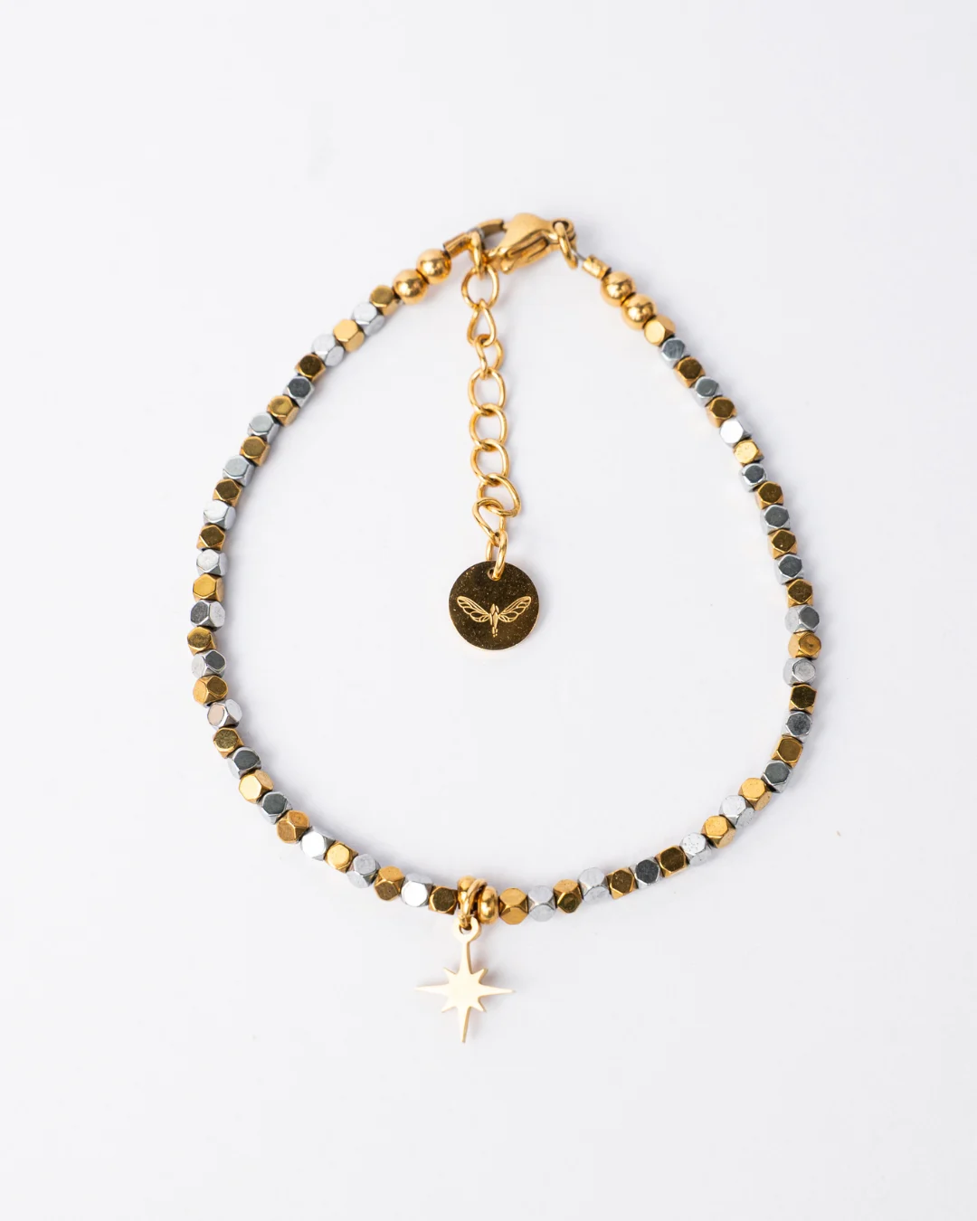 • Златиста гривна – редуващи се златист и сребрист хематит със златисти закопчалка, удължител и златиста висулка звездичка.